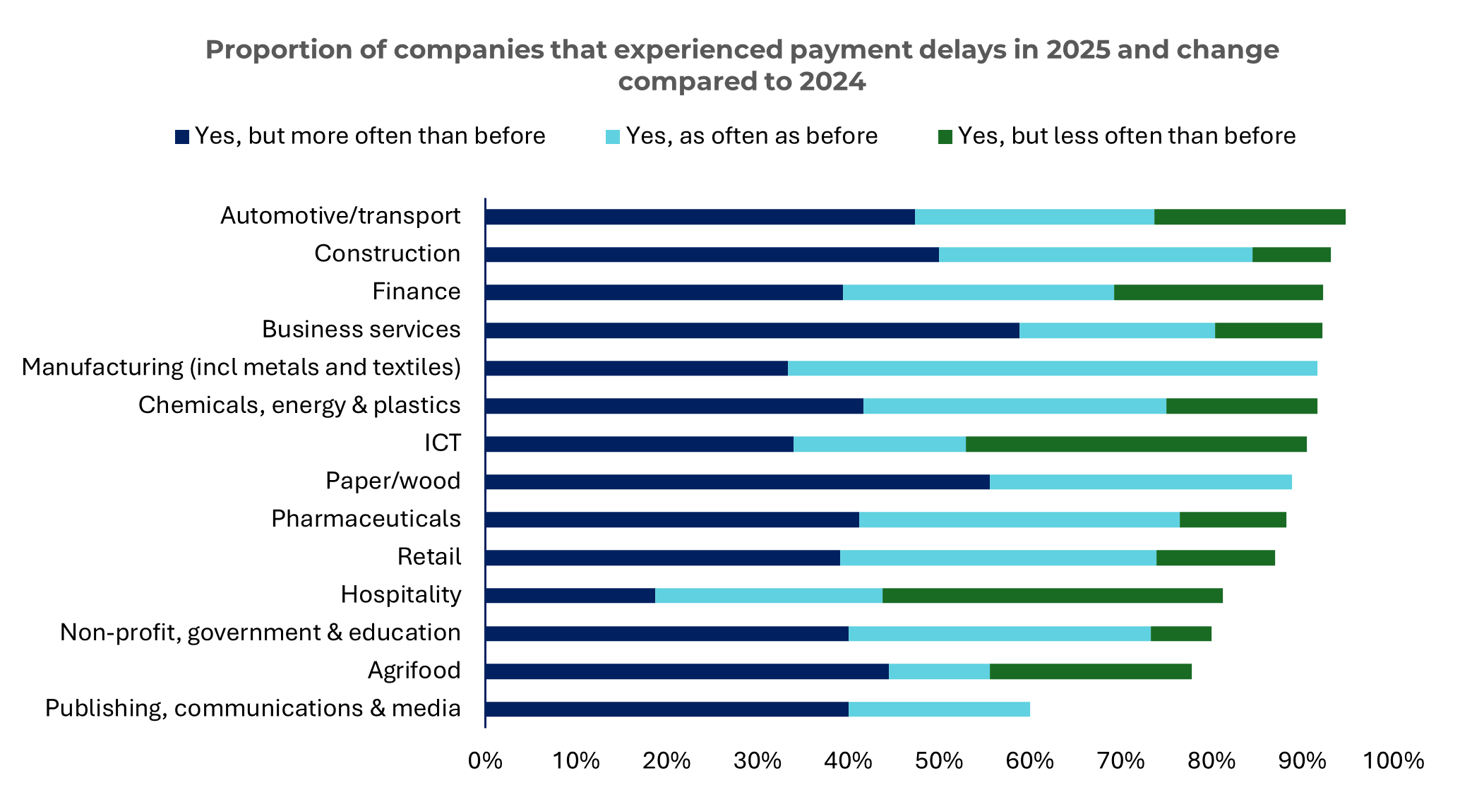 La construcción y el transporte son los más afectados por el aumento de los retrasos en los pagos (95 % y 93 %, respectivamente), mientras que los sectores editorial, de las comunicaciones y los medios de comunicación (60 %), agroalimentario (78 %) y sin fines de lucro, gubernamental y educativo (78 %) registran menos problemas. Esto se debe a menudo a plazos de pago más largos o a una mayor disciplina por parte de los compradores.
